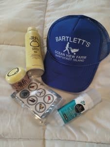 Well, sun protection is essential for a Caribbean cruise. My daughter and I are both big fans of the Sun Bum kid’s spray. Cassidy loves that it smells like bubble gum and I like that it has been made to spray on to wet skin. It’s hard enough to get kids out of the pool for a sunscreen break, never mind making them wait until they are dry. As some destinations are getting more serious about protecting their reefs, a port or two ours require mineral sunscreen. So, we are bringing a sunstick from All Good as well. It’s great mineral-based protection and the solid stick can go in our carryon instead of needing to be checked. As a bug spray spill in the luggage isn’t something I am willing to risk for a chance of bugginess, a sheet of Nantucket Spider bug repellant stickers is much easier to pack. And, you’ve got have a hat. I will happily sport some Bartlett’s garb on the ship. It’s always fun to see how many people out there are fans of the farm.